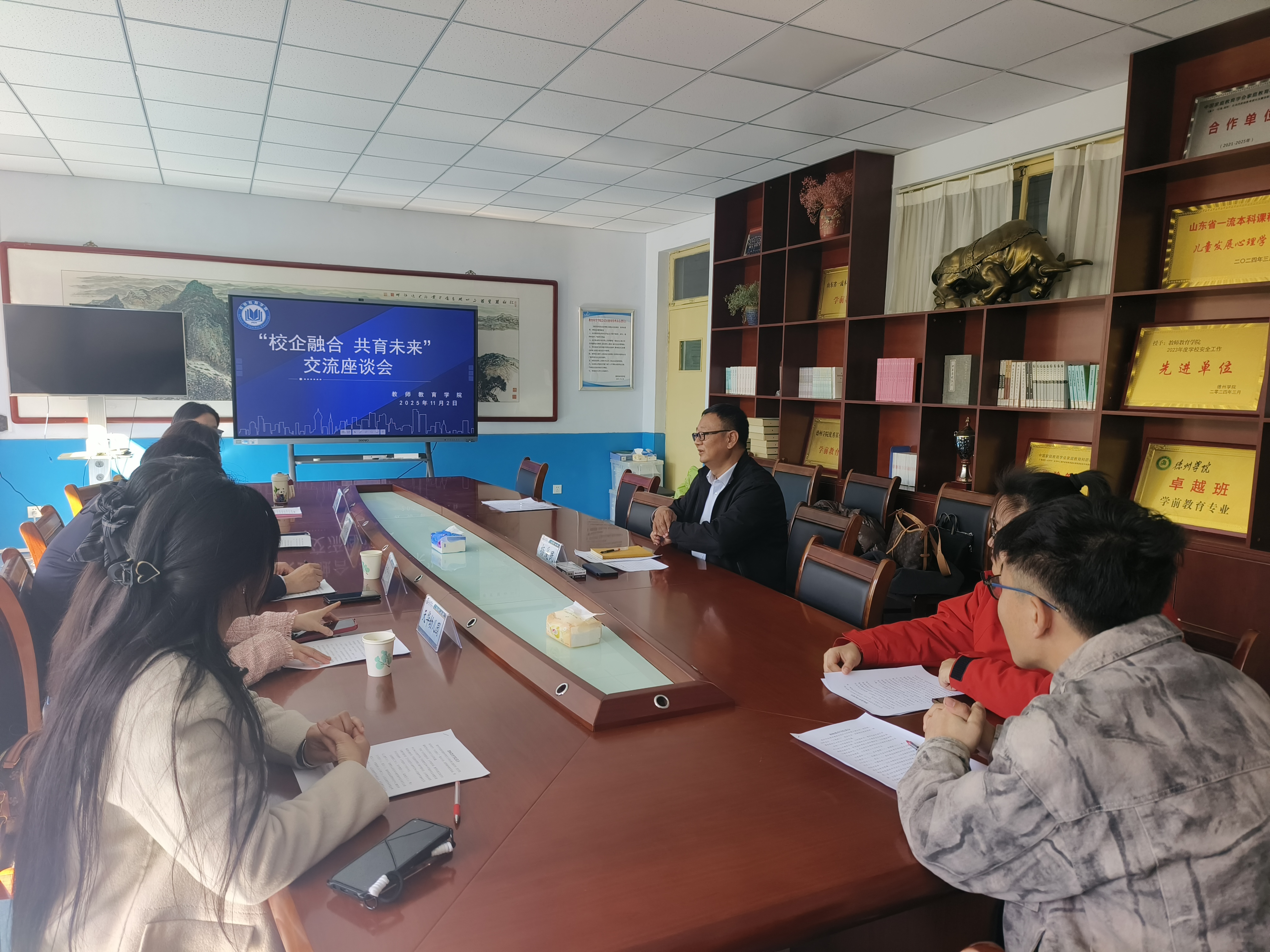 11月2日上午,为深化校企合作育人机制、强化校企合作联盟,我院在知行楼302会议室举办了“校企融合 共育未来”交流座谈会。座谈会由我院党委书记杨爱民主持,山东知远教育集团、山东金话筒教育咨询有限公司、德州青少年宫幼儿园、德州天华幼儿园和兴德高中等多家单位领导或企业代表参加了座谈。