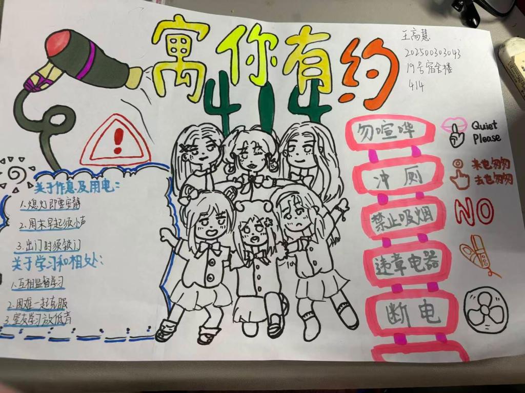 活动伊始,77779193永利以宣传公示规则的方式开展宿舍公约征集活动,号召各宿舍组队设计公约手抄报,同学们踊跃参与投稿,校楼委会同学全程做好作品整理汇总工作,后续还评选出一二三等奖共11名。